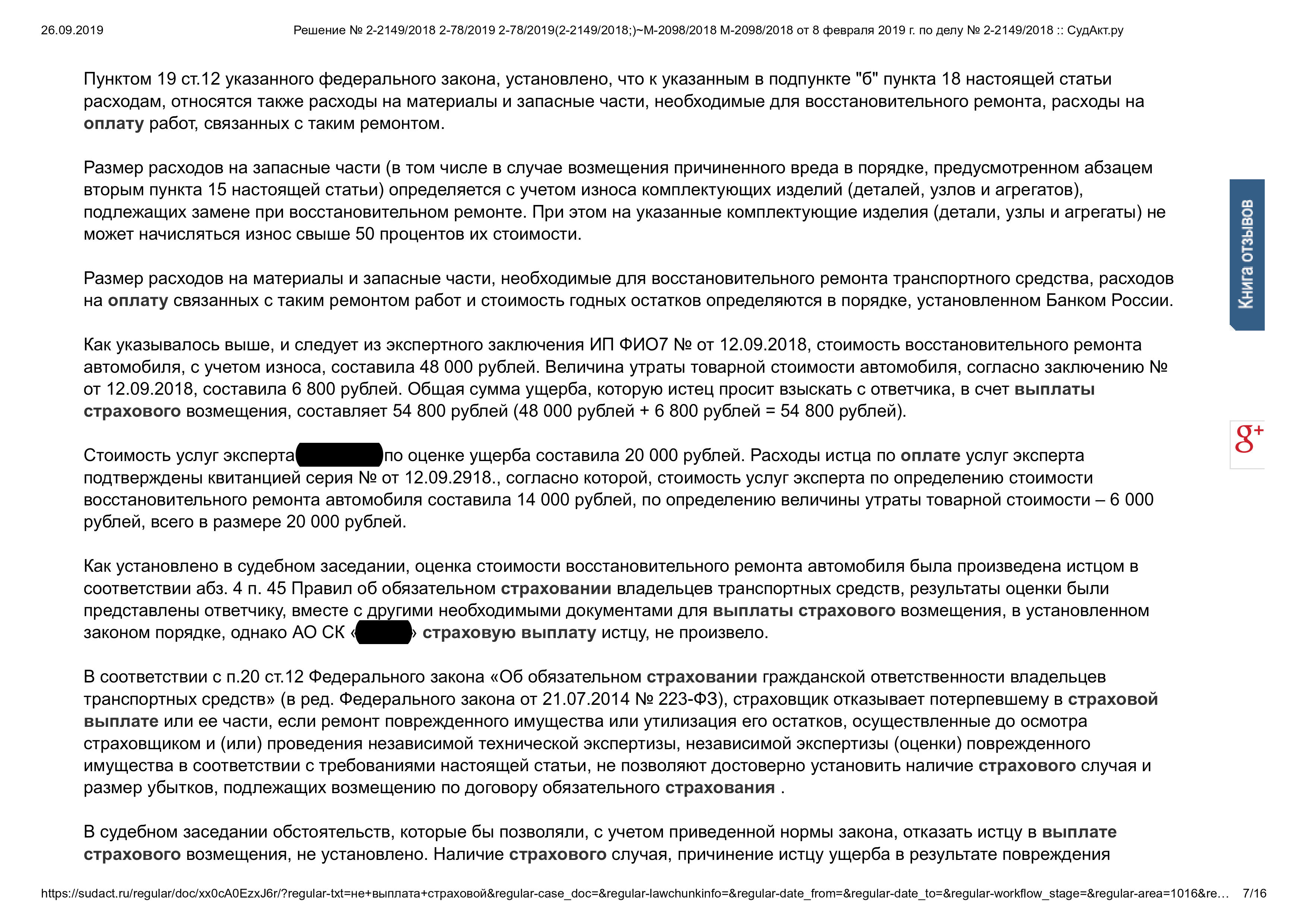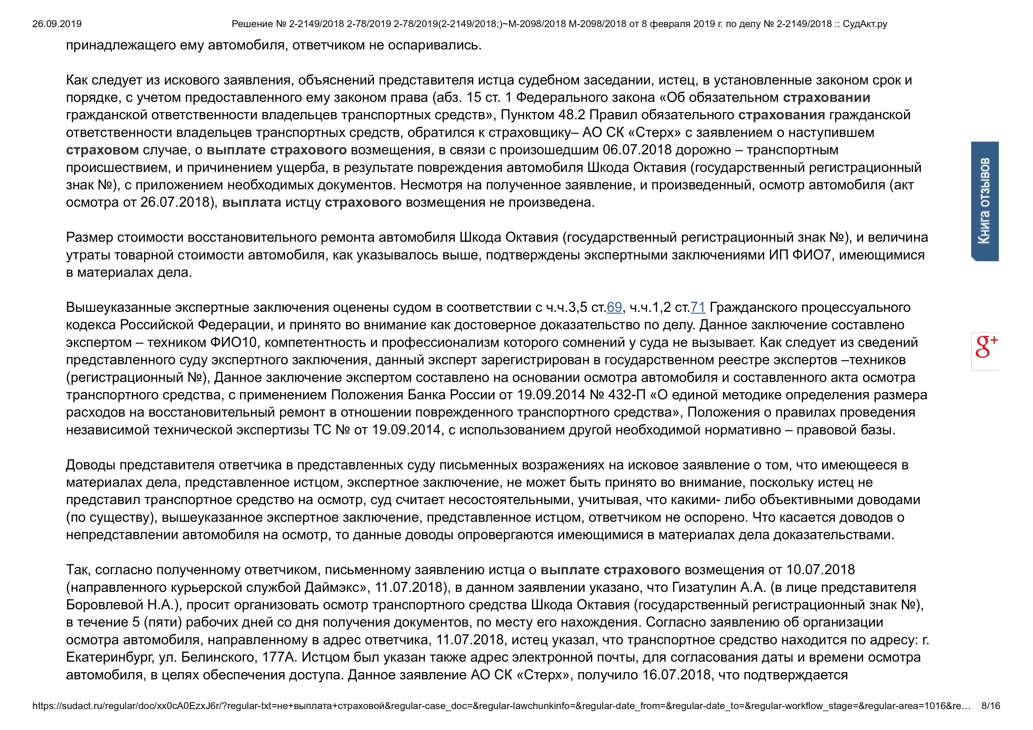Суд решил: Взыскать с ответчика в пользу истца в счет возмещения ущерба, причиненного в результате дорожно – транспортного происшествия: в счет выплаты страхового возмещения – 54 800 рублей; в счет возмещения расходов по оплате услуг эксперта – 20 000 рублей; в счет компенсации морального вреда – 8 000 рублей; в счет уплаты штрафа ответчика – 27 400 рублей, в счет возмещения судебных расходов: по оплате услуг нотариуса – 2 490 рублей; по оплате копировальных услуг – 920 рублей; по оплате юридических услуг представителя – 15 000 рублей. Взыскать с ответчика государственную пошлину в доход местного бюджета – 2 744 рубля.