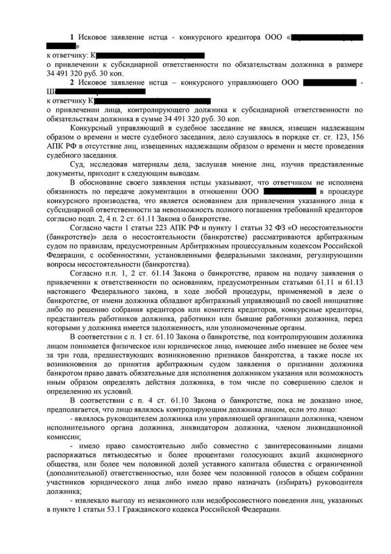 В связи с банкротством компании клиента К. обратился к адвокату, поскольку в арбитражный суд было подано заявление о привлечении его к субсидиарной ответственности на сумму более 34 млн. руб.