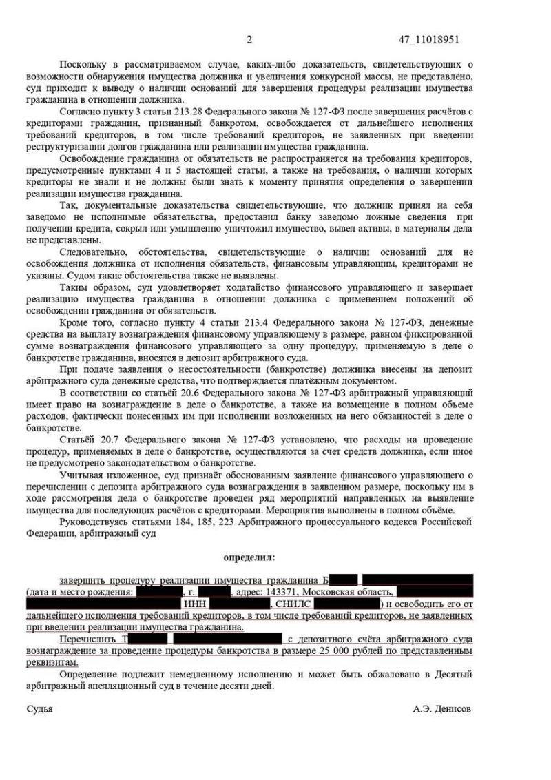 Адвокат проанализировал финансовое положение клиента, собрал все необходимые документы, подготовил заявление о банкротстве и обратился в арбитражный суд, в результате чего была введена процедура реализации имущества должника и был утвержден указанный в заявлении финансовый управляющий, который провел процедуру банкротства за 6 месяцев.