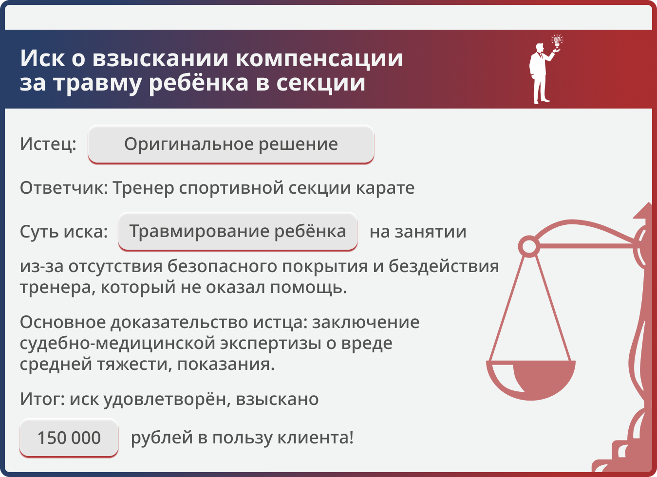 Даже если ребёнок пострадал в частной спортивной секции, грамотная юридическая работа и доказательная база позволяют привлечь виновное лицо к ответственности и получить реальную компенсацию.