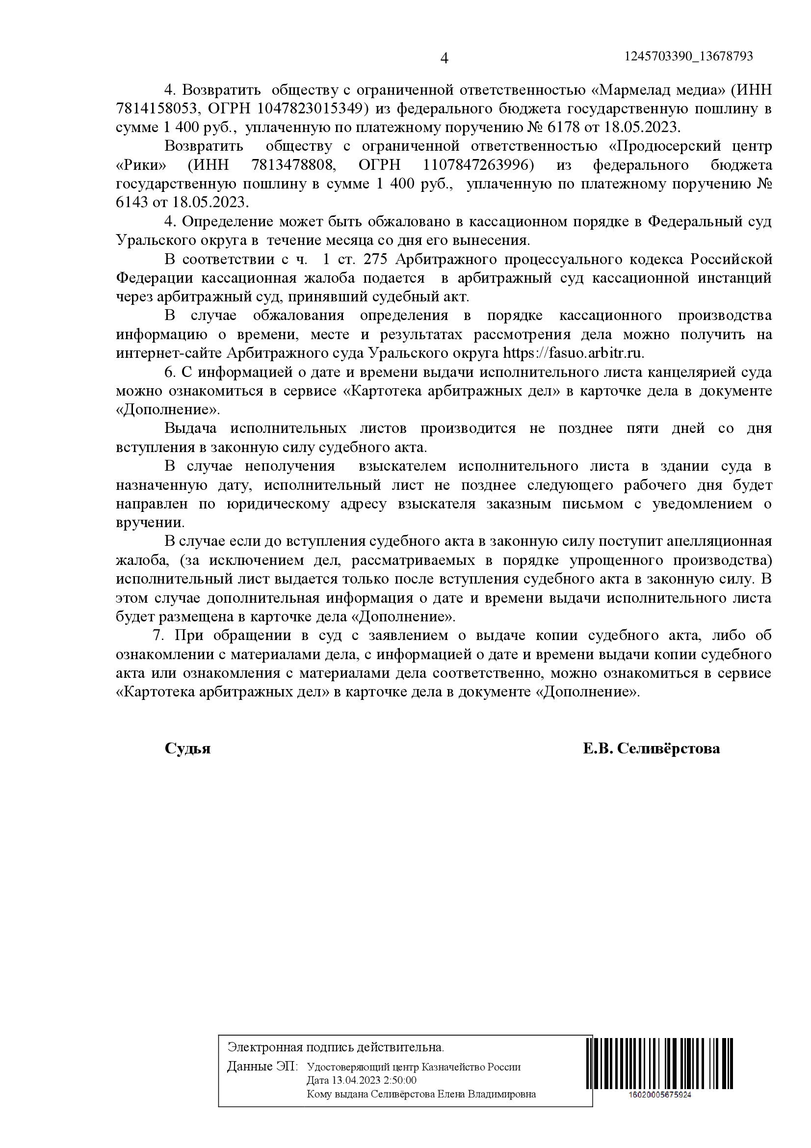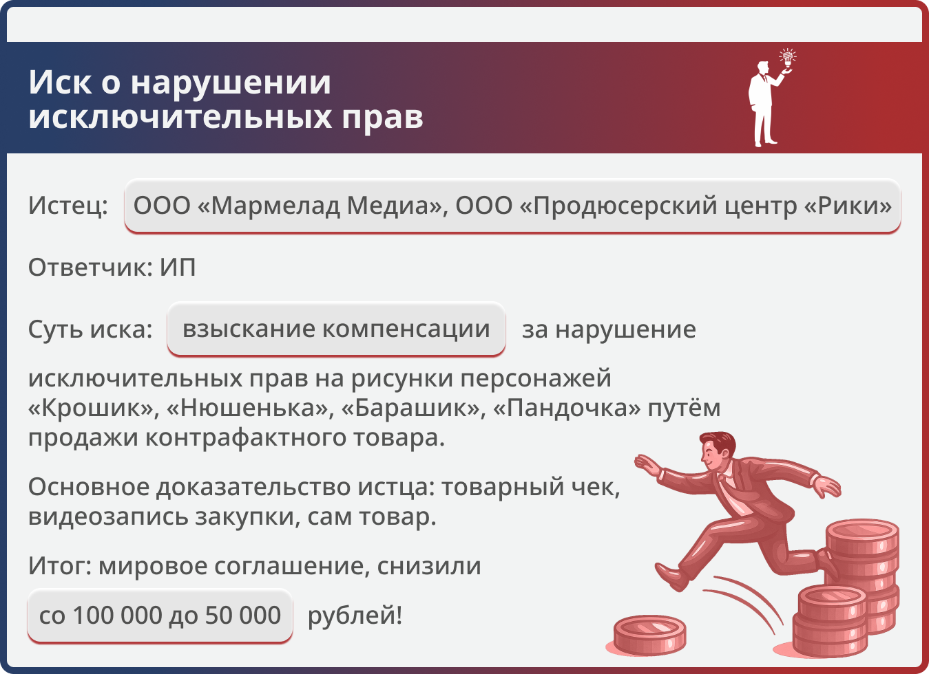 Истцы (ООО «Мармелад Медиа» и ООО «Продюсерский центр «Рики») обратились в Арбитражный суд Свердловской области с иском к ИП о взыскании 100 000 руб. компенсации за нарушение исключительных прав на товарные знаки и художественные произведения (рисунки) персонажей анимационного сериала «Малышарики»: «Крошик», «Нюшенька», «Барашик», «Пандочка». В ходе рассмотрения дела стороны заявили о заключении мирового соглашения и представили его текст на утверждение суда.