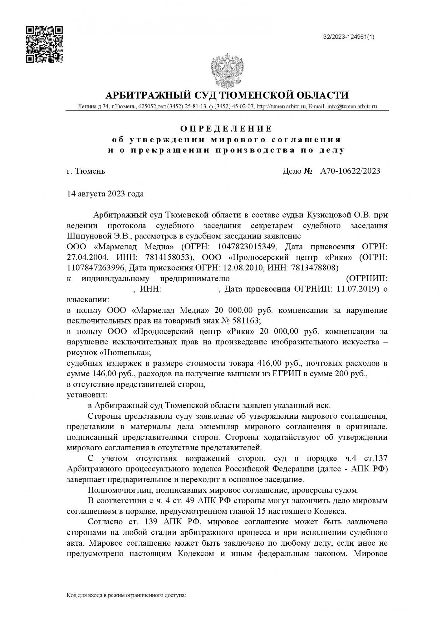 ООО «Мармелад Медиа» и ООО «Продюсерский центр «Рики» обратились в Арбитражный суд г. Тюмени с иском к Индивидуальному предпринимателю с требованием о взыскании компенсации за нарушение исключительных прав на рисунки (изображения) «Нюшенька» в размере 40 000 руб.