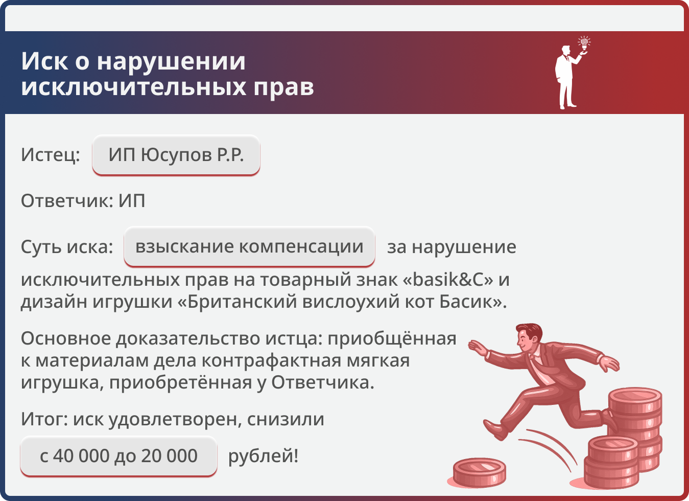 Успешная защита интересов ИП в споре о взыскании компенсации за использование чужого товарного знака и дизайна игрушки. Наши юристы добились сокращения суммы выплат на 50%, а также уменьшения сопутствующих судебных расходов.