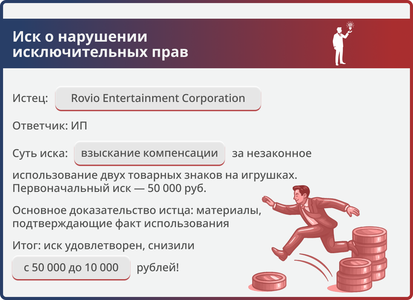 К нам за помощью обратился индивидуальный предприниматель, против которого был подан иск от компании Rovio Entertainment Corporation о взыскании 50 000 рублей в качестве компенсации за нарушение прав на два товарных знака. Задачей нашей команды была не просто формальная защита, а активная работа по минимизации убытков клиента в ситуации, когда факт спора рассматривался в упрощенном порядке.