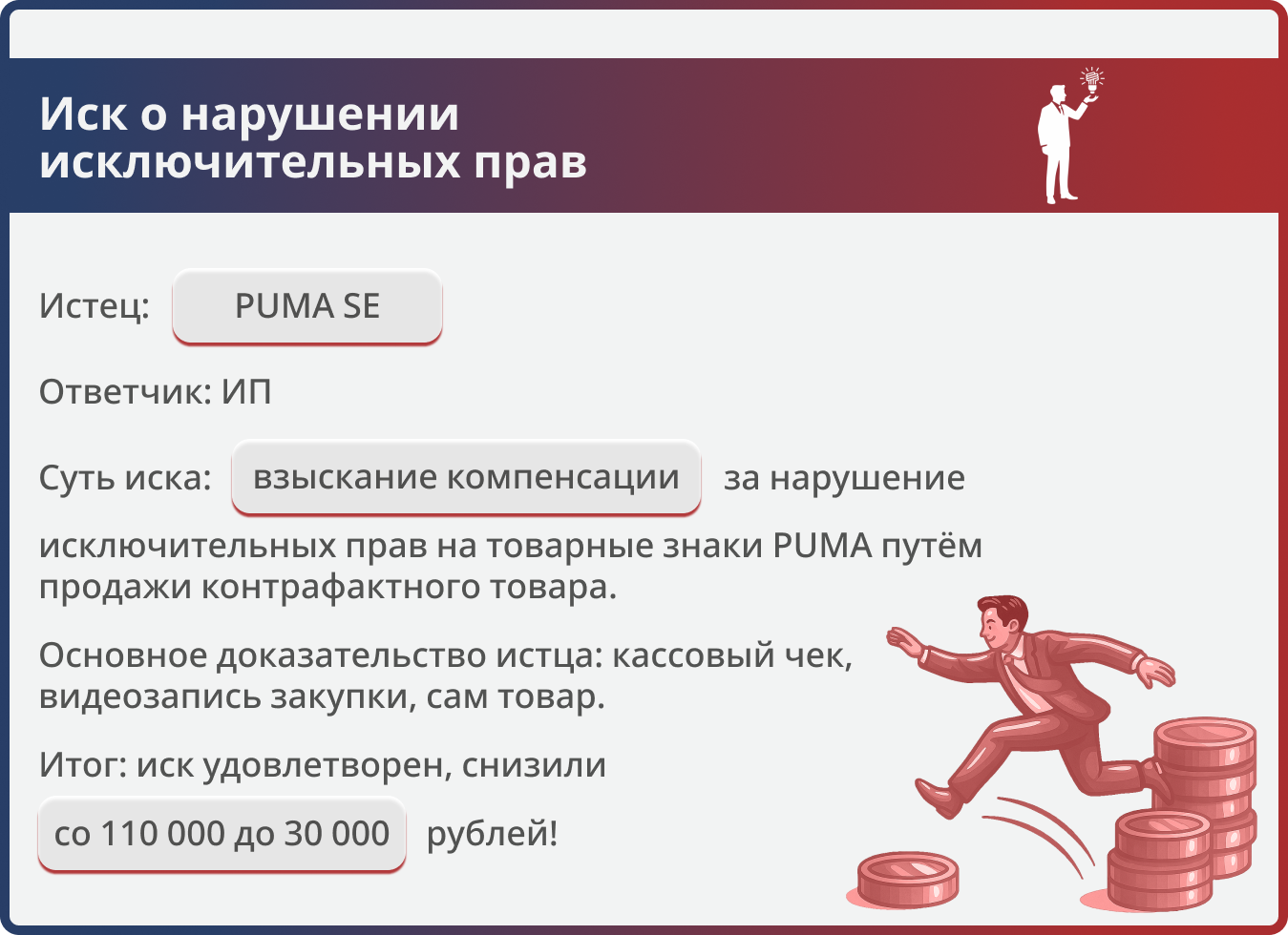 Дело показывает, что даже крупные мировые бренды, такие как PUMA, не получают автоматически всю заявленную сумму компенсации. Грамотное обоснование несоразмерности, указание на незначительную стоимость товара и отсутствие доказательств убытков позволяют кратно снизить итоговую сумму взыскания — в данном случае более чем в 3,5 раза.