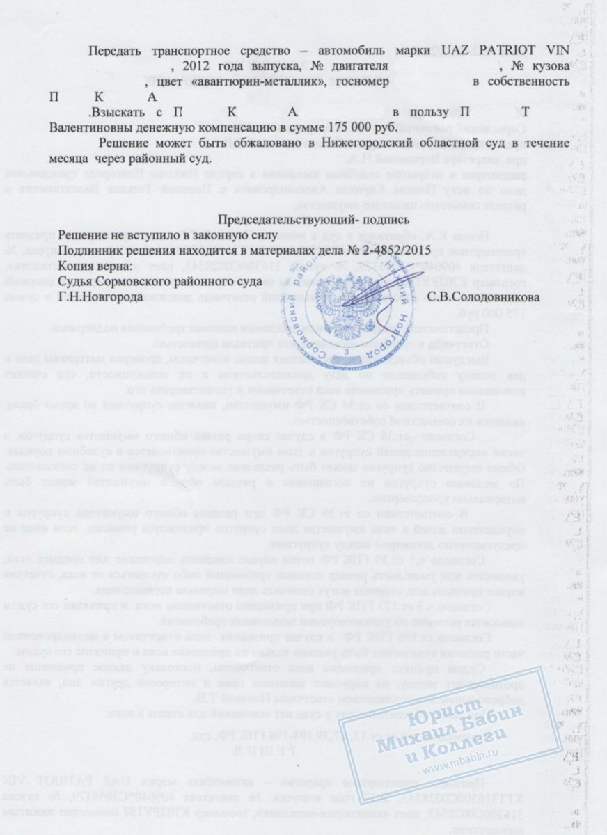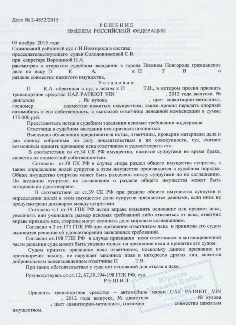 Юрист помог разделить супругам после развода спорное имущество - автомобиль - выгодным для обеих сторон образом